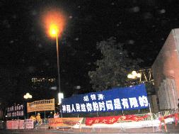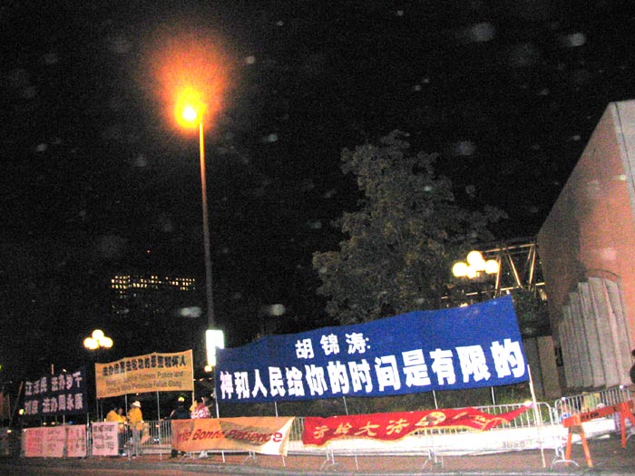 在黑夜和寒风中,法轮功学员拉出唤醒胡锦涛良知的横幅。