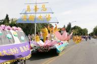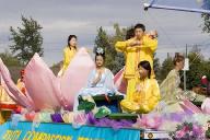 ![]() 法轮功的游行队伍 | ![]() 法轮功的游行队伍 | ![]() 在花车上示范功法 |