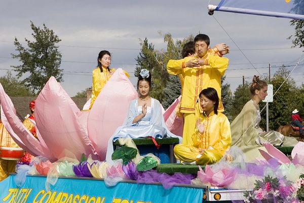游行之前,当我们把花车拉到游行队伍的指定位置和腰鼓队排练时,许多参加游行的队伍好奇而又友好的看着。大法学员就在参加游行的人群中散发小莲花,并借机向他们简短的介绍法轮功及所受到的迫害。因为是竞技表演游行,许多人骑马或者乘车来参加。游行当中,许多骑在马上和坐在花车上的漂亮女孩都拿着小莲花。人们总是非常高兴接受小莲花。