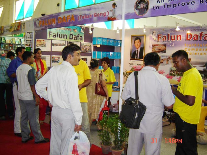 十名斯里兰卡的学员和来自印度孟买,海德拉巴和本格拉等城市的学员也参加了书展。学员们巡回在大展厅开阔的地方演示功法,派发传单。9天的书展期间,学员每天都派发出数千张英文和印度语的传单。这是让人们了解法轮大法,并向他们讲清真象的好机会。许多人想知道,为什么在这个充满商业气息的书市上,我们却向他们提供了这么有益的东西,而且还是免费的。