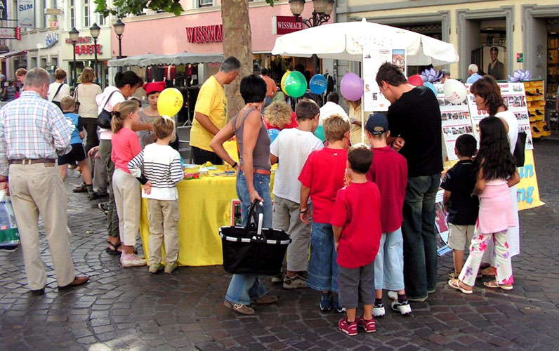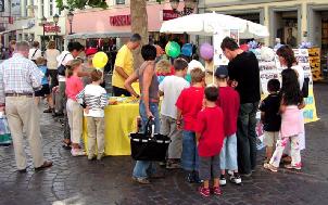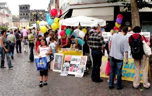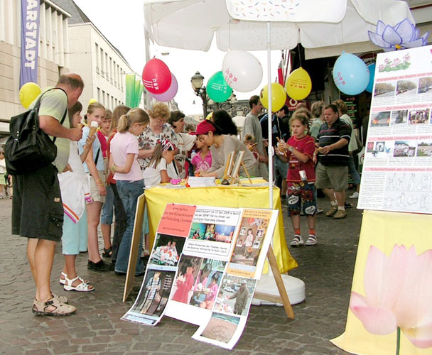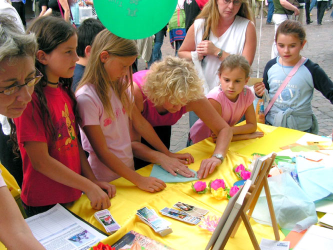 【明慧网2005年9月13日】特里尔(Trier)是德国西南部的一个城市,位于摩泽尔河畔,靠近卢森堡边界。2005年9月10日,星期六,几千名儿童和他们的家庭汇聚在这里举行游艺活动。在法轮功的台位上,聚集了一批又一批的孩子前来学习制作五彩莲花,倾听大法的歌曲;而他们的父母们却以极大的兴趣观看为营救在中国受