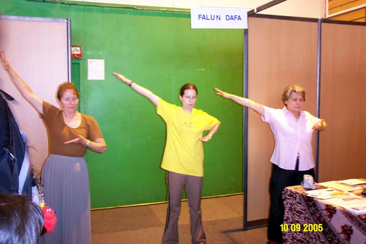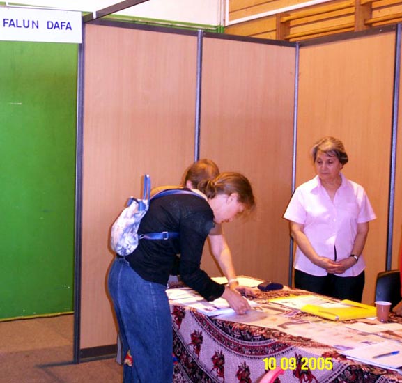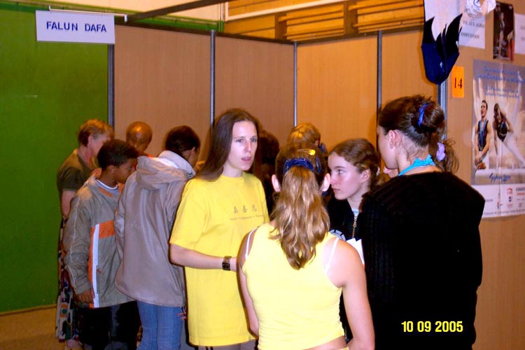 场馆内祥和的大法音乐与大法弟子们精彩的功法演示感动了在场的观众。表演完毕后,人们报以热烈的掌声和欢呼声答谢大法弟子们。在法轮功的摊位上,学员们将功法演示图片、和各类英、法文真象资料,摆在桌上以方便人们阅读和索取。很多人过来询问真象,并表示希望去当地的炼功点学功。有许多人在反迫害的征签表上签名。