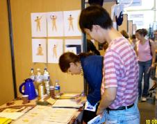 还有人全神贯注的观看摊位前的功法演示。当听说教功是免费的时,很多人都大吃一惊──在物欲横流、崇尚金钱的今天,居然还存在着这样纯正无私的修炼团体。