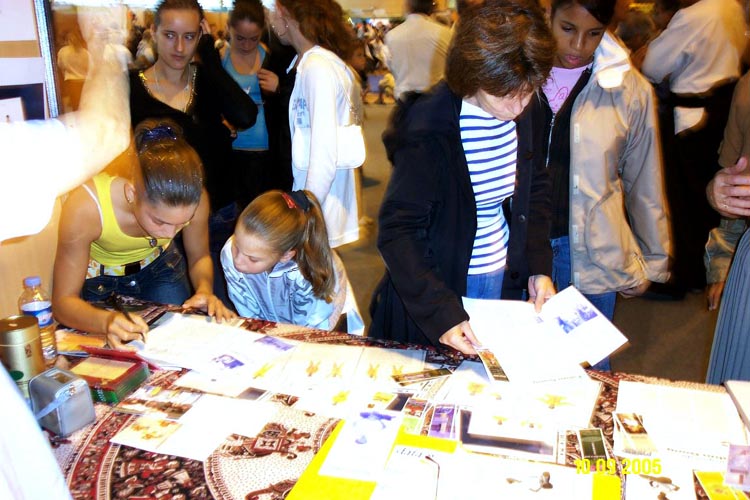 大法弟子们还送给孩子们,印有各民族小弟子炼功照片的书签和明信片,并告诉他们法轮功在中国被迫害的真象,年龄很小的孩子都能够听懂;并有的立刻跟所有的同伴,一字一句的重述大法弟子所讲的真象,还在征签表上签下了那纯真的善心。