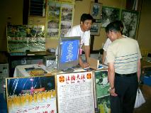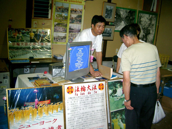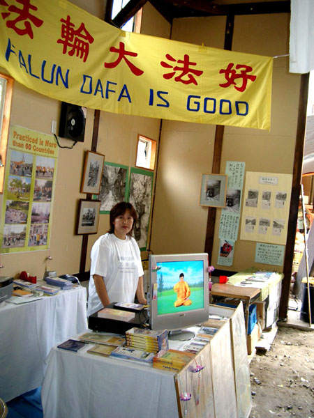 学员们在展位上方打出了“法轮大法好”横幅,并在展位上摆放了日、中、英文大法书籍,教功录像带,和有关法轮功的真象资料;同时还利用电视播放李老师的教功录像,并进行义务教功。
