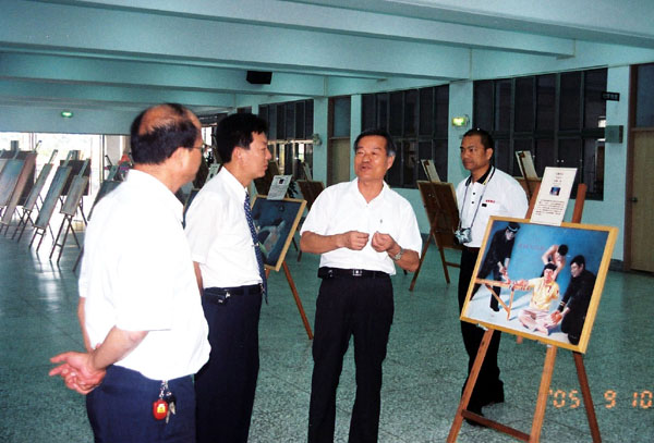 北港镇镇长徐忠彻到场参观。一边仔细的看画作,一边聚精会神听导览的解说,默默的了解每一幅画背后的故事。