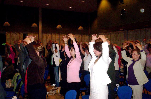 。资料及书籍很快告罄。其后大家还一起炼起了第二套功法——法轮桩法,参与者均感到极强的能量场。最后,掌声和赞叹声不绝于耳……。