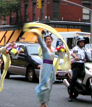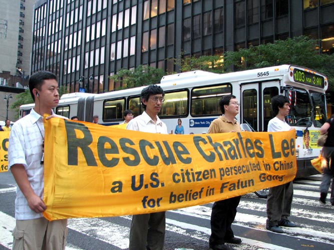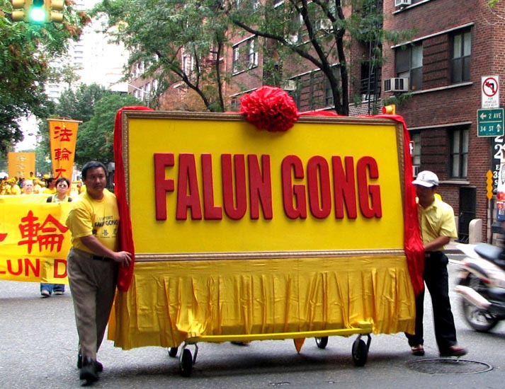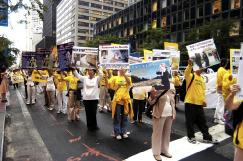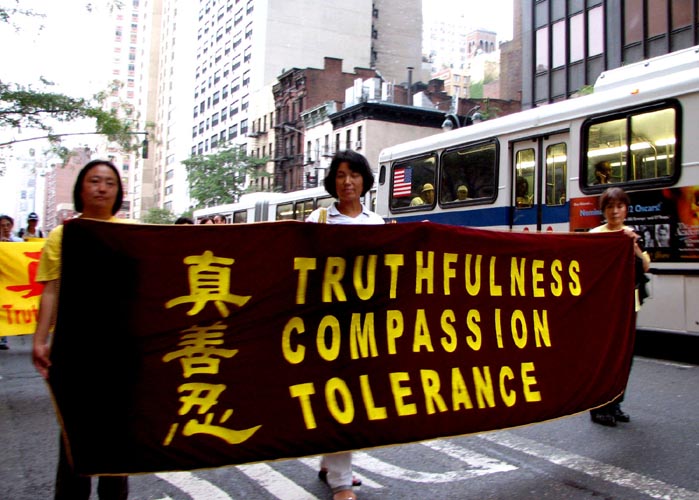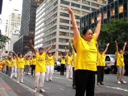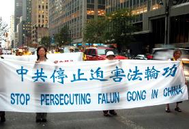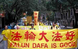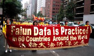 ![]() 队伍以一写着英文“法轮功”的金黄横匾为前导 | ![]() 告诉世人“法轮大法好” |