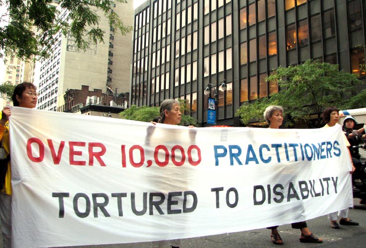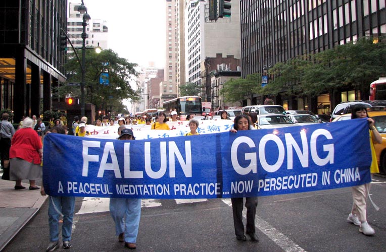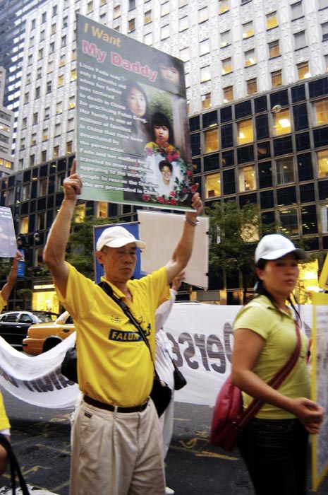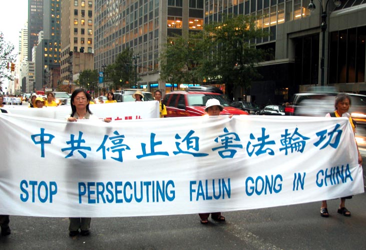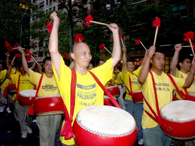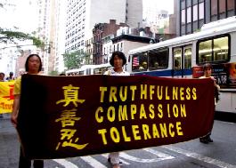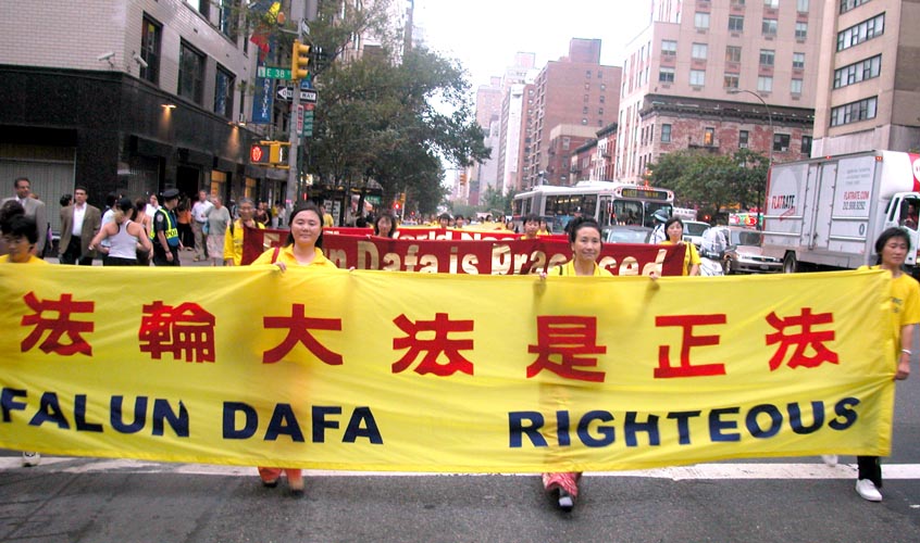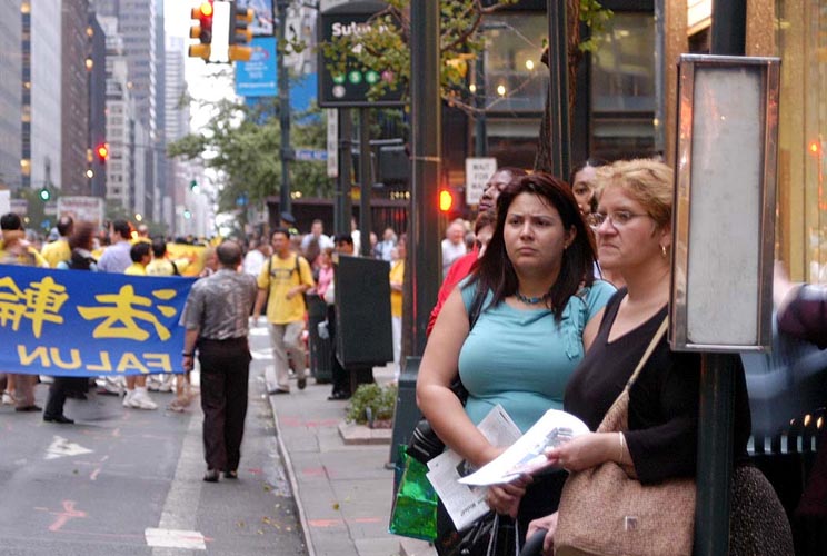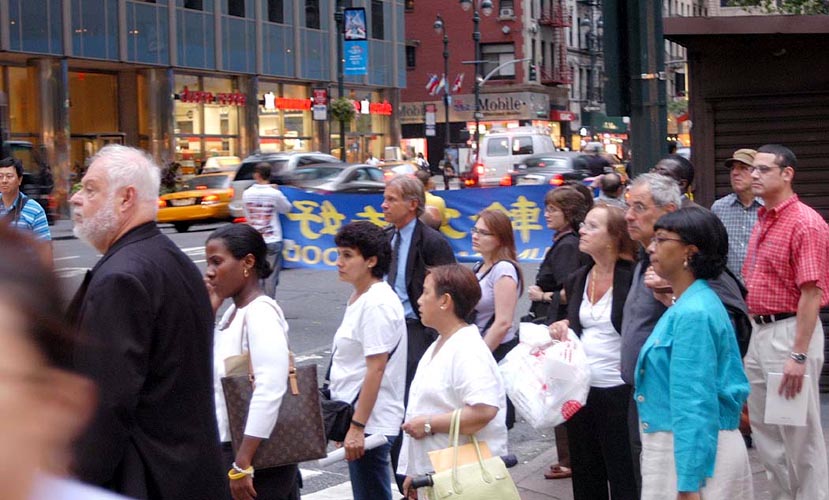 傍晚约6点,正值下班高峰时间,曼哈顿中城的行人和车流熙熙攘攘,好不热闹。法轮功学员的游行队伍,由开着摩托车的警察开道和卫护,从35街、1大道出发,经由3大道,再折转47街,最后到达联合国大楼旁。队伍延绵十几个街区,气势磅礴,绵绵长长,首不见尾。下班族们惊讶于这浩荡的队伍,许多人仔细阅读着横幅的内容,有的人匆忙取出手机拍下这历史镜头,有的人鼓掌,还报以会心支持的微笑。