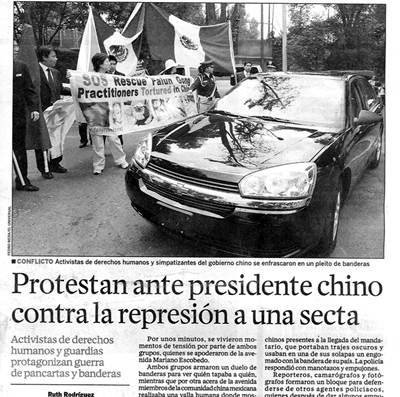 12日胡访问墨西哥议会时,警察在大楼左侧早已摆好栏杆,防暴警察严阵以待。亲共人士陆续聚集在此,法轮功学员在栏杆旁打出巨大中、英、墨文横幅:“停止迫害法轮功”、“法办江泽民、法办罗干、法办刘京、法办周永康”、“法办迫害法轮功的恶警和坏人”、“胡锦涛,神和人民给你的时间是有限的”、“法轮大法,真、善、忍”。