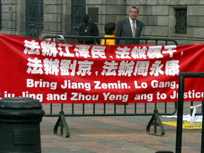 各路人马守候多时,却不见胡踪影,后来才被告知胡已从大楼右侧进入。于是两名墨西哥法轮功学员守候在大楼右侧,在胡即将离开之际将一大型中英文横幅“法办江泽民 法办罗干 法办刘京 法办周永康”展开。胡及其随行人员一一从横幅前走过。