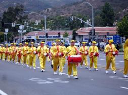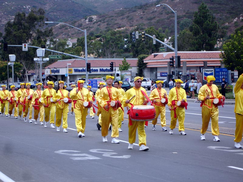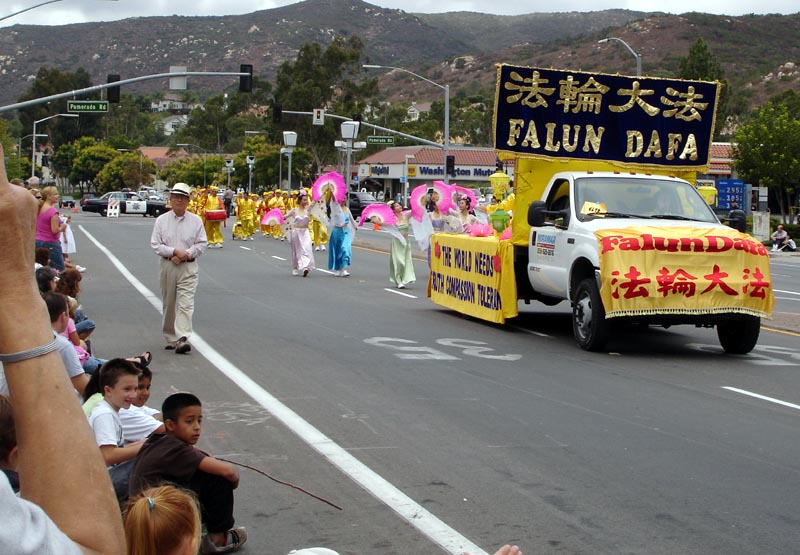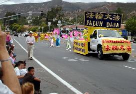 法轮大法的队伍由四部份组成:四名分别来自中国、美国和墨西哥的学员打着巨幅的中英文“法轮大法”横幅走在最前面,接下来是用莲花、彩旗、灯笼等布置的美不胜收的花车,上面四位学员表演着舒缓优雅的五套功法。花车后面,六位“仙女”表演的彩扇舞美轮美奂。走在最后的是威武雄壮的法轮功腰鼓队。