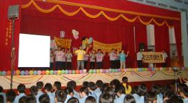 结尾则是在舞台左侧以投影方式,播放真象闪画及西方大法弟子的创作歌曲“When Sea Water Turns Sweet”(当海水变甜)。该校校长、训导主任及同学们观赏表演时的专注神情,让人感受到大法弟子纯正之场笼罩整座礼堂。谢幕之际,学生们频频报以热烈掌声,对法轮功社团的演出印象深刻。