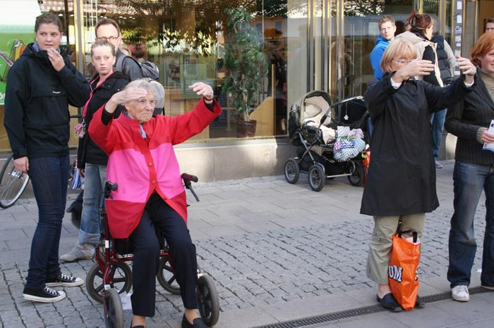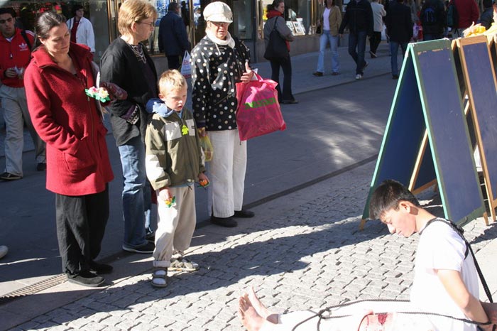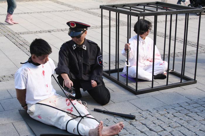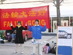 活动在繁华的商业街中心,一边是优美的炼功音乐及法轮功学员祥和的功法表演,另一边是模拟演示中共迫害法轮功学员的残暴酷刑,强烈的反差深深打动了当地居民,引来一批批的人观看。从人们惊讶愤怒的目光、同情的泪水和踊跃的签名中,可见他们内心的震动。