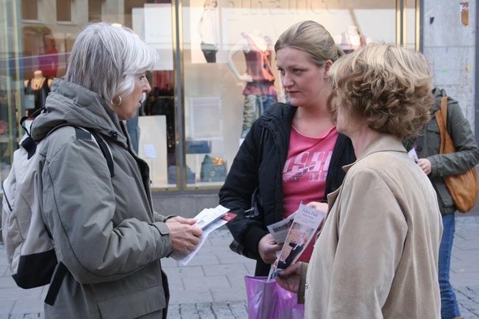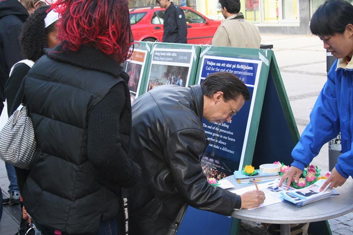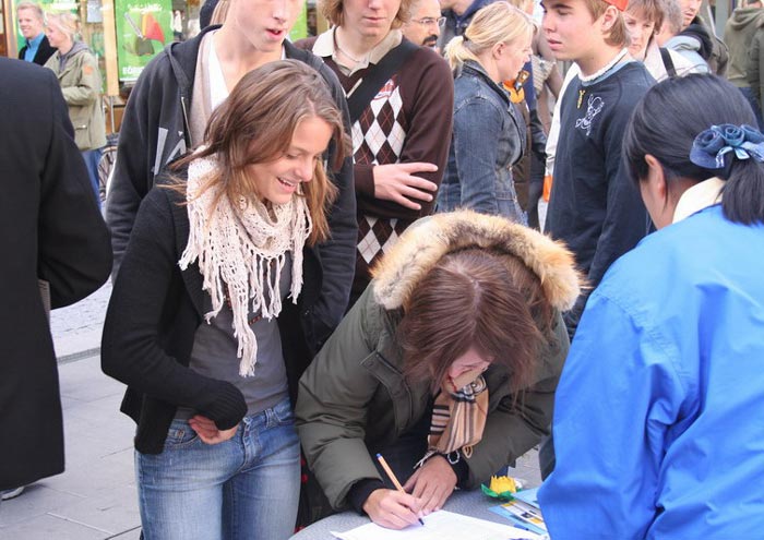 一位瑞典的女大学生,明白了真象后,又叫来了她的好朋友,两人一同在签字簿上签上了自己的名字。有一位男士签了名后还用手机告诉家人,让家人赶快过来看看中国正在发生的迫害。有的人不仅签了名还将自己的通信地址和联系电话都写在了签字簿上。有一对年轻的夫妇,写了两个地址,并对学员说,我们不在这个地址住时,在那个地址肯定会找到我们的。