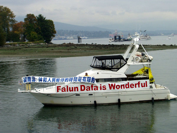 报导说,一条停泊在港湾码头的船上挂着白底红字横幅标语,上面写着“法轮大法好”,另外一条稍微小一点的横幅上写着“胡锦涛:神和人民给你的时间是有限的”。