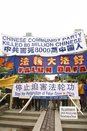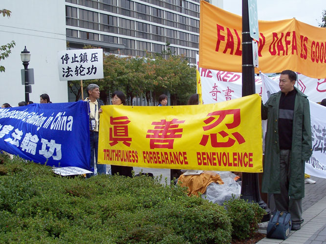 在新闻稿中说,在胡锦涛下榻的维斯汀酒店(Westin Hotel)四周,法轮功学员打出了呼吁停止迫害法轮功,法办江、罗、刘、周,法办迫害法轮功的恶警和坏人,以及对胡的忠告:神和人民给你的时间是有限的,等横幅和标语牌。