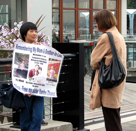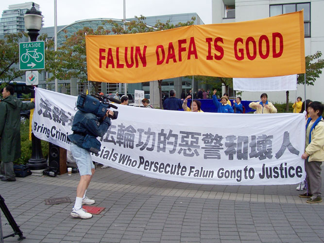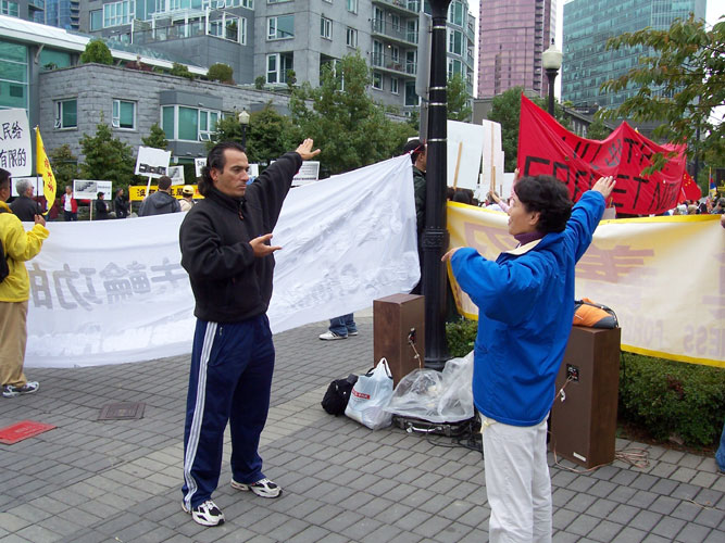 16日下午5时左右,几位法轮功学员在胡下榻的一侧,打出“法办江、罗、刘、周”的大横幅。不久,两个手拿小红旗的年轻人冲过来,横蛮的把横幅从学员手中强扯过去,并扔在地上,还出口骂学员。一位当地居民刚好路过,见状,就指着他们说:这是加拿大,不许你们在此行恶。那两个小年轻顿时愣了一下,但还欲再次上前从学员手中抢横幅。那位加拿大女士上前不停的呵斥他们:“不许行恶,不许行恶!”