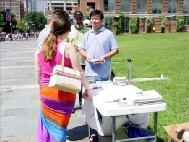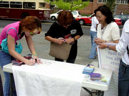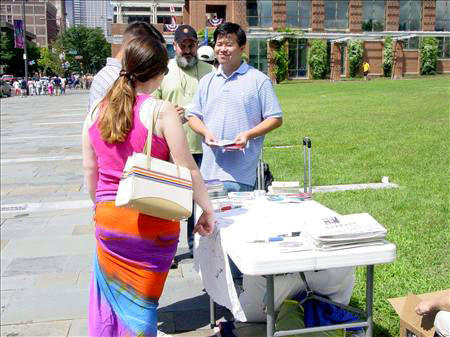 【明慧网2005年9月2日】2005年8月27日,大费城地区的法轮功学员在自由钟旁進行征签活动,呼吁总统布什在下月与胡锦涛的会晤中,要求停止
