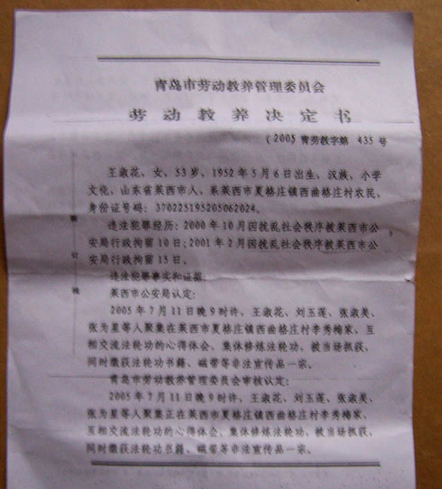 2004年2月13日,我正在家干活,治安员贾四清带领深州市公安局恶警贾双万、张玉超等十多人非法闯入我家中,不由分说掠走手机一部,大、小录音机两台,讲法带、大法书等资料。强行给我带上背铐,绑架到市看守所,非法关押50天后,非法判我劳教两年,关入高阳劳教所。