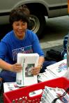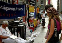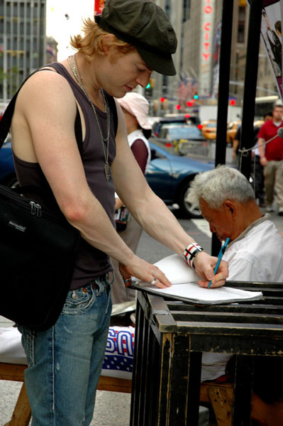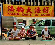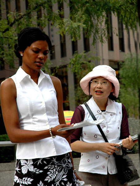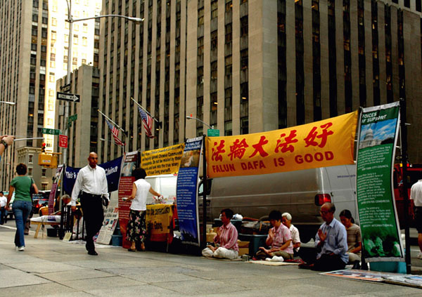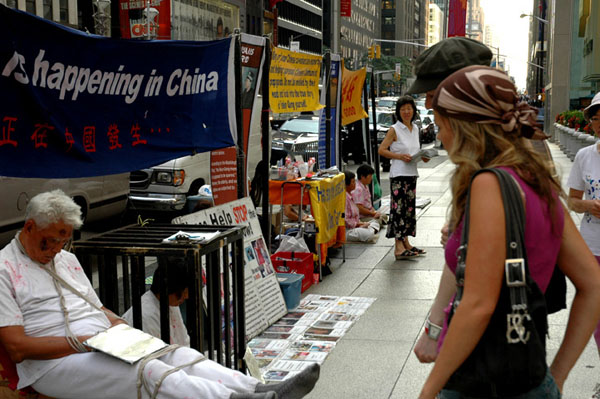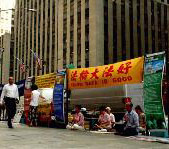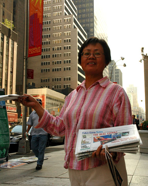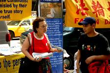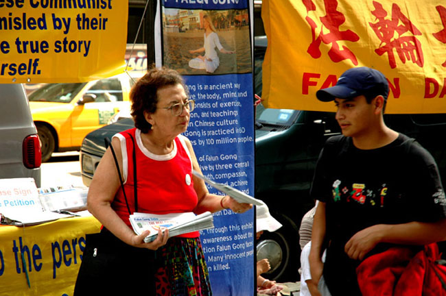 大法弟子中有一些来自其它国家的。例如,马来西亚的杨女士从去年四月就在曼哈顿发资料讲真象了,几乎每天都会来到曼哈顿。她不停的一句接一句说着她唯一会说的英语:“Falun Dafa is good(法轮大法好)”,说了500多天了。
