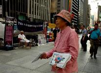 70多岁的姚女士和她的丈夫坐了30个小时的飞机从南太平洋的新西兰岛来到纽约,下了飞机睡了3、4个小时就站在了曼哈顿大街上。每天一站就是近十个小时,不知疲倦地向人们讲真象。