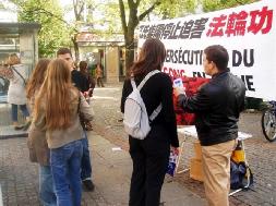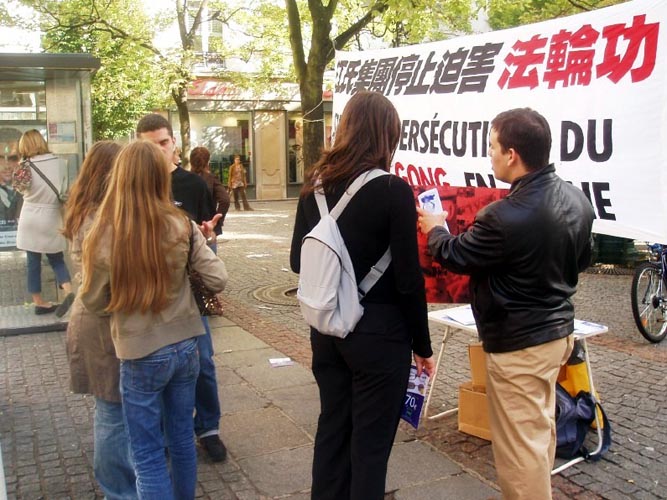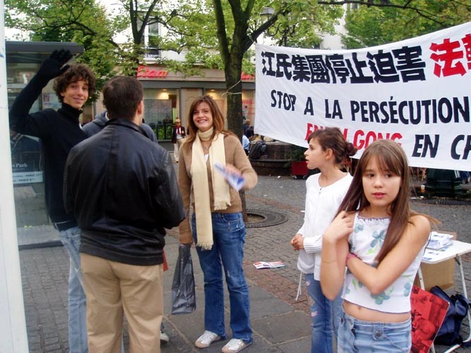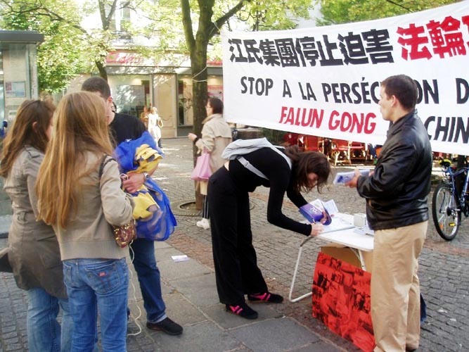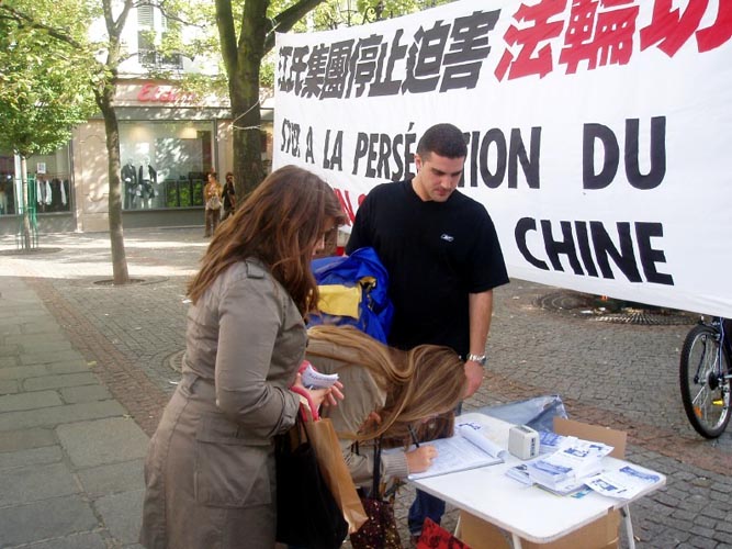 在活动中,法国法轮大法弟子们在真象横幅前向过往行人散发了大量真象资料,并与希望了解更多真象的人们详细讲述了中共邪党在中国大陆非法镇压、迫害、虐杀法轮功学员及其企图将迫害延伸至海外的真实情况。明白了真象的人们十分震惊和气愤,纷纷签名反对迫害。