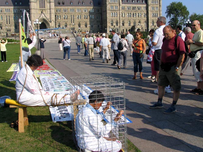 在烈日下,来自多伦多、蒙特利尔、渥太华以及金斯顿的学员连续两周在首都渥太华办反酷刑展。他们大多是老年弟子。有几位已经年逾古稀。许多经过反酷刑展的加拿大人被她们的在烈日中,为同胞呼吁的精神所感动,都签名支持停止迫害法轮功。一位来自金斯顿的阿姨说,国内的同修因为坚持信仰,在真正的承受着酷刑,比起他们来,我们吃的这点苦真的不算什么。