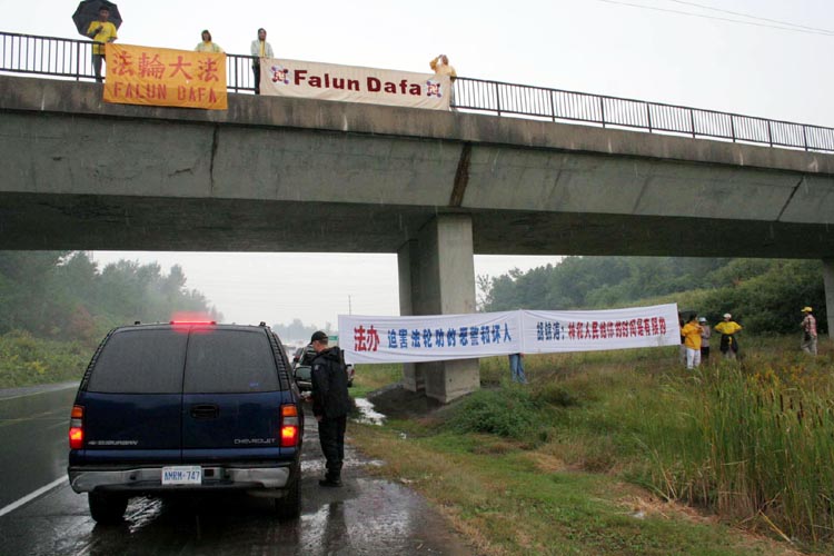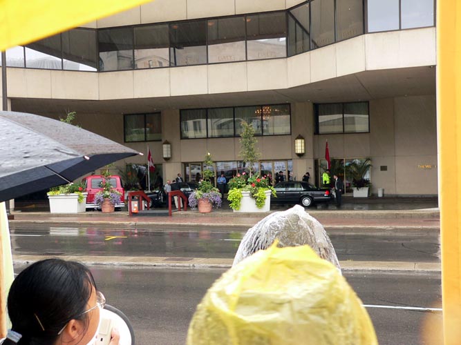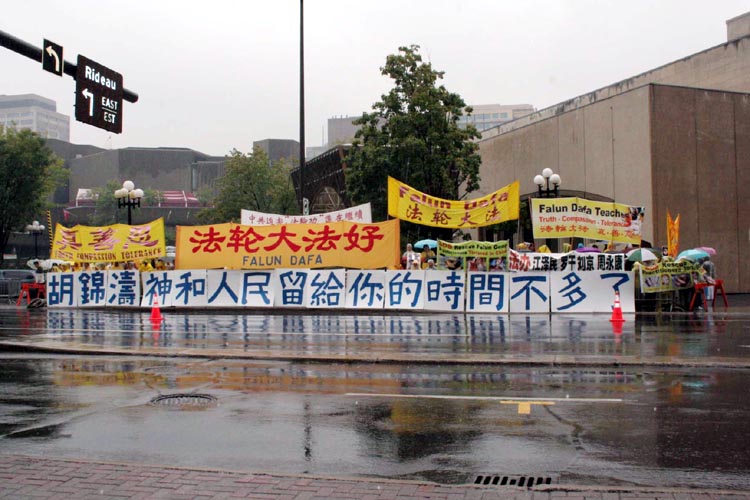 8日,胡锦涛一早在瓢泼大雨中抵达渥太华,并驶往WESTIN 旅馆。法轮功学员沿途冒着大雨,打出横幅:“法办江泽民、罗干、刘京、周永康”,“法办迫害法轮功的恶警和坏人”,“胡锦涛,神和人民给你的时间是有限的”,以及“停止迫害法轮功”、“法轮大法好”等信息。
