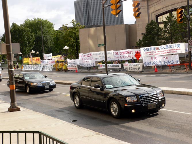 ![]() 在旅馆前的这条路上,胡锦涛的车队来往十多次,每次都从法轮功学员打出的横幅和“9评”退党横幅前经过 |