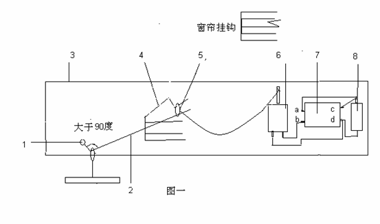 工作原理:当按遥控器“开”时,a与b连通,电机转动,将铁环拉开,铁棍2落下,棍上挂的铁环滑下,绳子脱落,条幅展开。