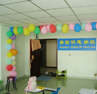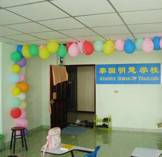 教室里摆放着学员捐献的课桌椅,黑板;墙上挂有师父的法像,“泰国明慧学校”横幅,彩色气球,以及各国明慧学校的活动照片等。目前,泰国明慧学校定为每周星期六下午开课,课程设有故事、音乐、美术、英语、手工等。