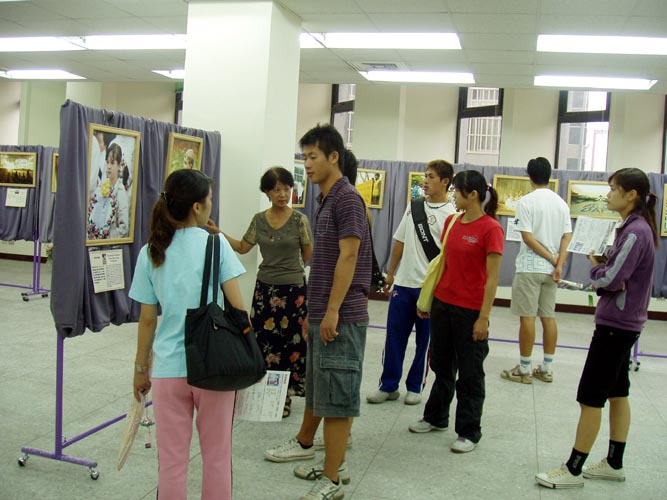 在整个活动中法轮功学员都主动支援,不计名不求报,自掏腰包默默付出,修炼者无私的境界在此展露无遗,承办这次展览的一对夫妻学员更是忙瘦了一圈。八天展期在大家正念正行中,老天也特别帮忙几乎都风和日丽,一直到闭幕当天卸完画才真下起雨来。
