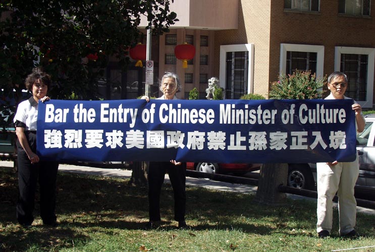 据美国新闻专线(U.S. Newswire)9月27日报道,法轮功的支持者们于9月27日中午在中共驻美大使馆外集会,敦促美国政府禁止中共文化部长孙家正入境美国。孙家正打算10月来美参加肯尼迪表演艺术中心举办的中国节活动。