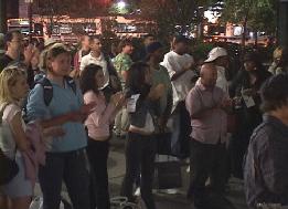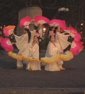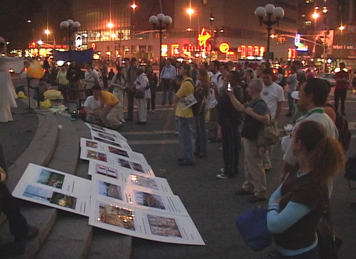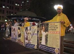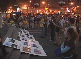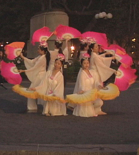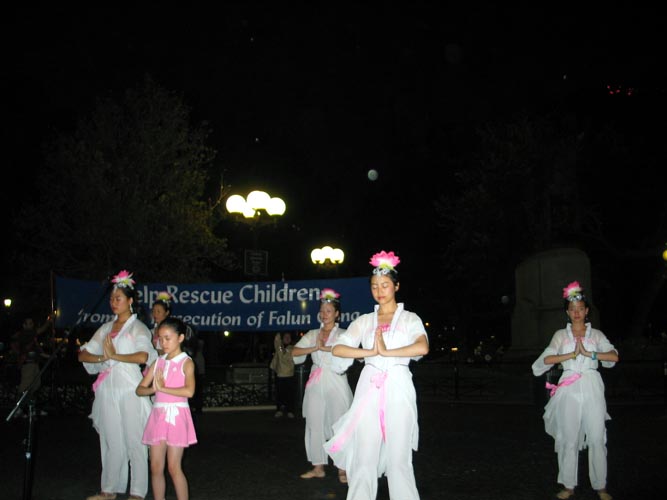 夜幕下,华灯初放,天骄艺术团的舞蹈“浊世清莲”吸引了所有人的目光,人们从四面赶来,站在那静静的欣赏。表演者身穿洁白的舞衣,手握嫣红羽扇翩翩起舞。一切似乎都静止了,唯有那如水的音乐,那柔美的舞蹈,那呼吁的横幅,那展现迫害的展板。