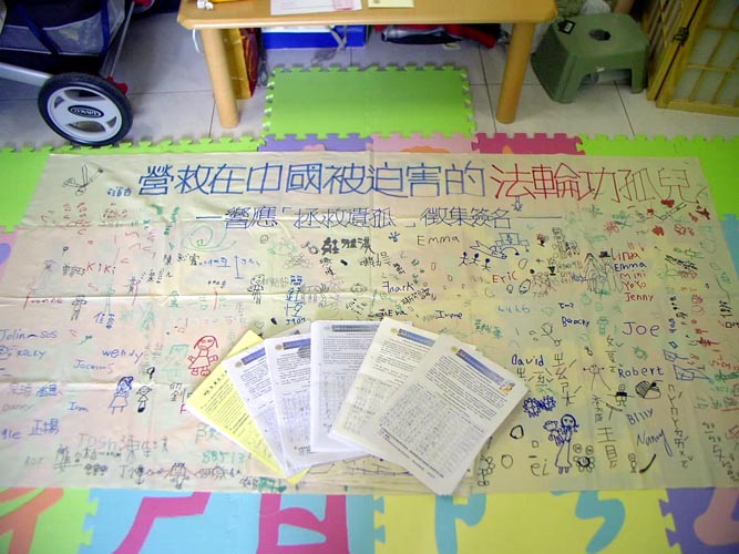 鉴于中国国家主席胡锦涛即将访问美国,为呼吁美国布什总统要求中共立即停止对法轮功的迫害,进而发放护照予法轮功遗孤,台湾营救协会与明慧学校利用小学生暑假返校日的机会,在学校播放营救遗孤的VCD并跟小朋友讲述法轮功遗孤的艰难生活,呼吁大家一起营救在中国大陆受迫害的法轮功小弟子,台湾营救协会已将收集来约2000笔之资料整理成册并与请愿信送交白宫布什总统。