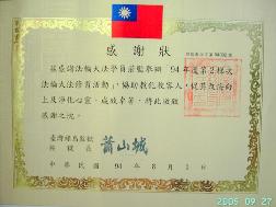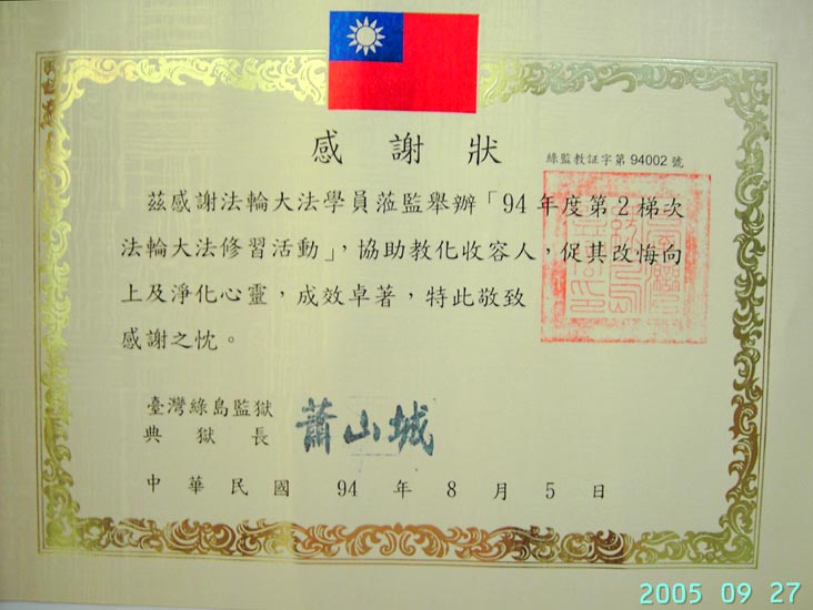 ![]() 绿岛监狱秘书辛孟南先生颁发感谢状给法轮功学员 | ![]() 感谢状内容 |