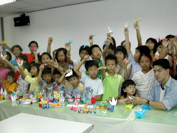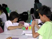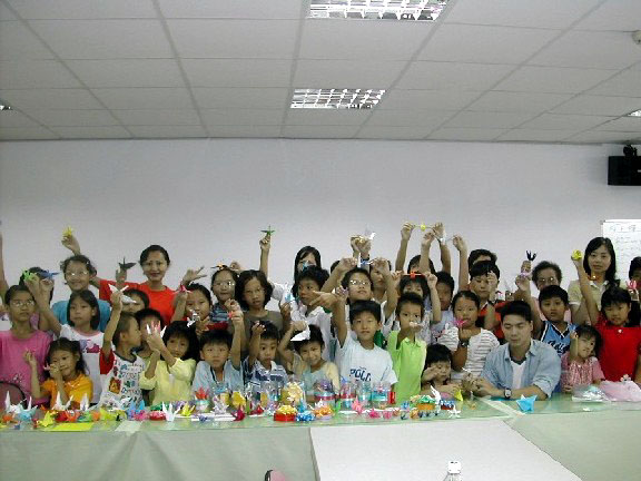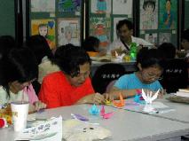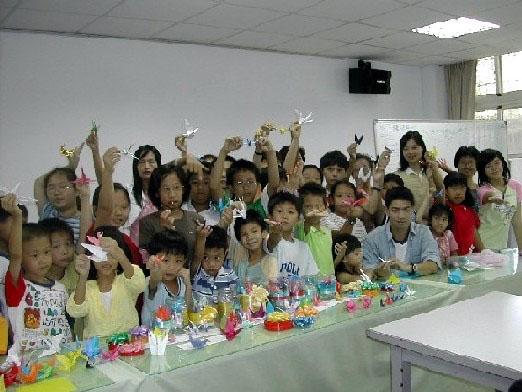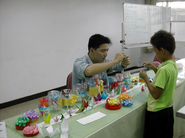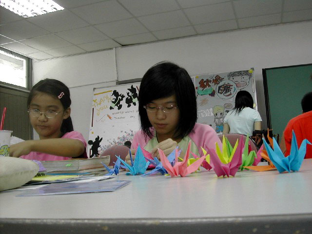 ![]() 授课老师仔细的对纸鹤的细部作调整 | ![]() 明慧小弟子专注又真诚的努力摺纸鹤 |