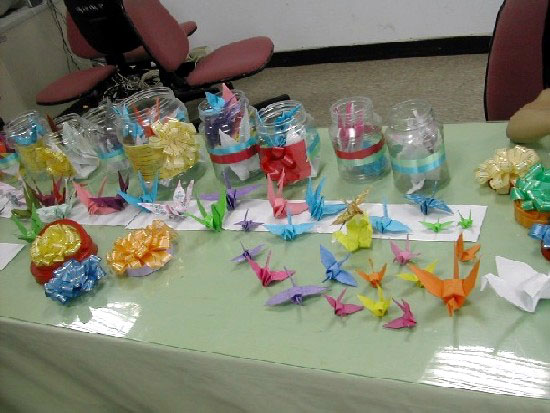在影片之后,大家都协助将纸鹤装在众多透明的瓶罐内,其中不同的瓶子代表了不同的国家,今天我们摺纸鹤送给世界各国元首,是要把明慧小朋友(台湾小朋友)对人权的重视,与对法轮功孤儿的爱心播撒在世界各个角落;呼吁所有善良的人们,发挥正义良知,共同制止这场残酷的迫害。呼吁人们关注这批一直身处于最阴暗的处境中、没有声音的人权受难者,尽早结束这场泯灭人性的浩劫--请大家支持营救在中国的法轮功孤儿!