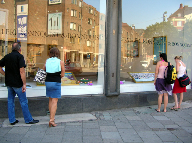 正值马尔默节,来到此地的游人也比以往多了几倍。坐落在市中心地带的画廊,吸引着人们的注意力。橱窗内摆设的艺术作品令很多人驻足,站在橱窗外欣赏着画作。大部份人走入画廊,仔细的听导览讲解,认真的看每一部作品。