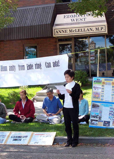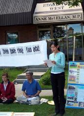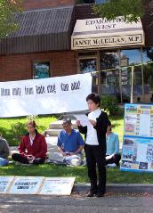 学员还宣读了埃市国会议员大卫•乔高(David Kilgour)给加拿大法轮大法协会的支持信;以及著名国际人权律师大卫•麦塔斯(David Matas)致加拿大安全部部长、移民部部长和外交部部长,要求政府拒绝发放签证给薄熙来和其他迫害法轮功的人权罪犯的信。