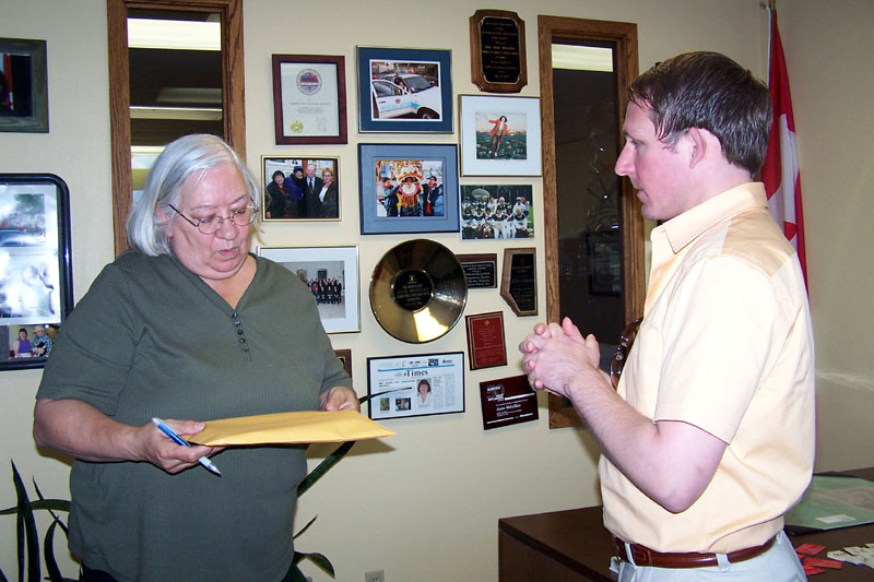 ![]() 向安妮•麦柯里兰办公室工作人员递交材料 |
