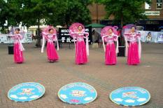 学员们向来往的行人和观众表演了自己创作的节目,包括莲花舞、伞舞、演唱和器乐演奏等。其间还展示了祥和舒缓的法轮功五套功法。