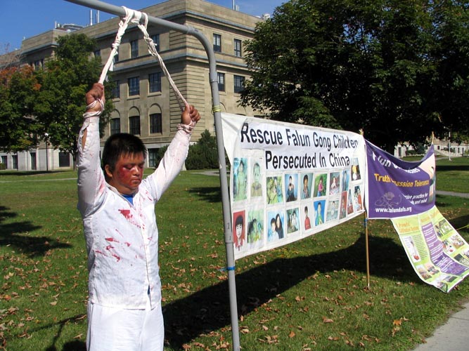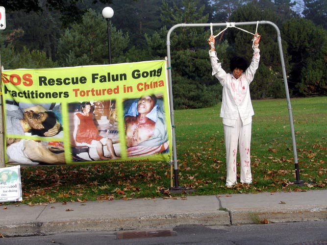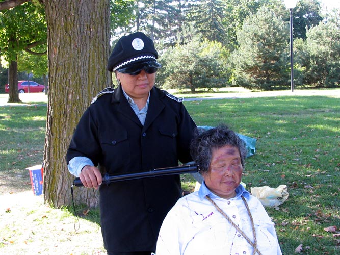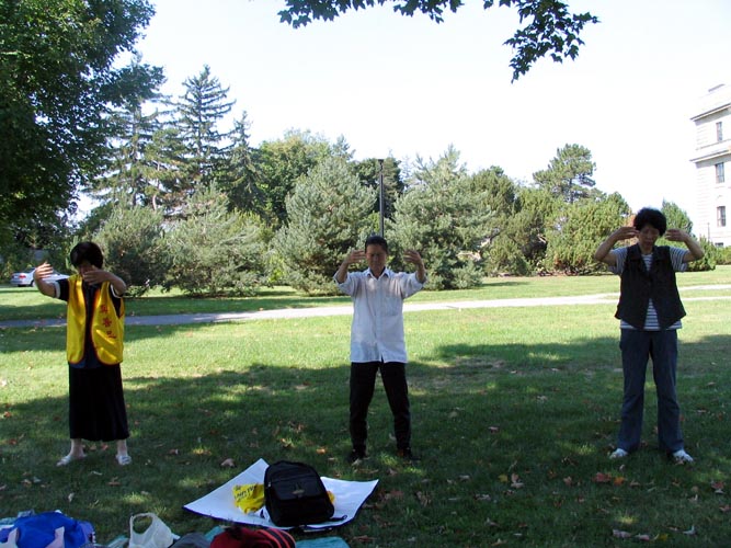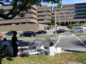 ![]() 外交部大楼前,几位年近七十的老年法轮功学员在做“反酷刑”演示。 |