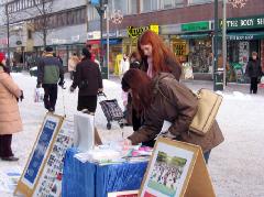 有两个女孩,看到迫害照片后非常吃惊的问,这些都是什么人啊?学员告诉她们,这是法轮功学员在中国被警察残酷迫害的真实情况,两个女孩说,怎么能发生这样的事。当仔细看了所有展板明白后,又问道,我们还没到18岁,可以签名吗?学员说,当然可以。她们立即签了名声援制止迫害。