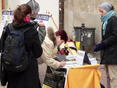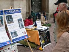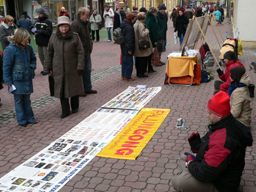 当天,法轮功学员伴随着大法的音乐炼着缓慢柔和的五套功法,路人被这祥和的场面所吸引,纷纷前来观看阅读揭露中共迫害法轮功的真相展板。尽管天气寒冷,但人们了解真相的热情并没有降低,有些人了解了真相后马上在要求停止迫害的抗议信上签上了自己的名字。