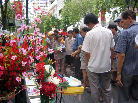 【明慧网2006年1月15日】2006年1月14日,新加坡法轮功学员在新加坡BUGIS 新年花市上设立2处图片展览,向人们讲述中共对法轮功残酷