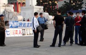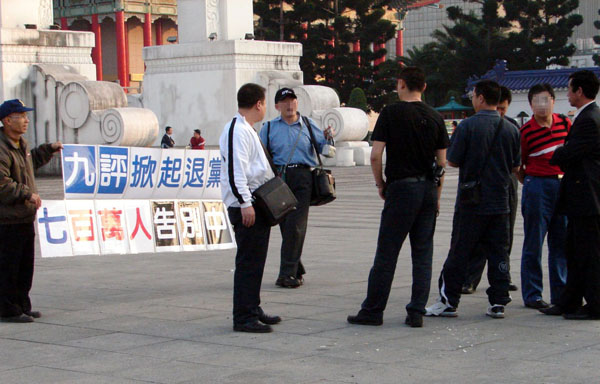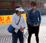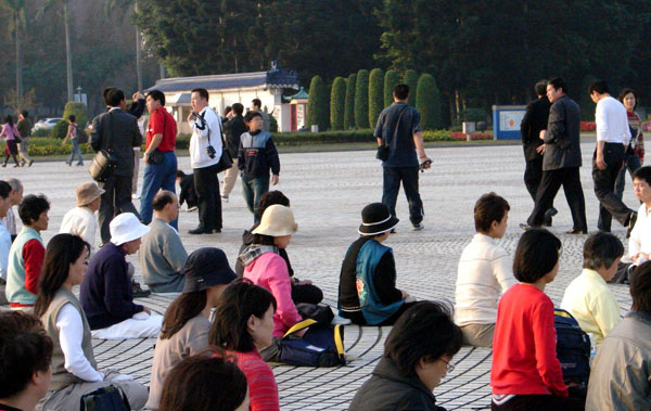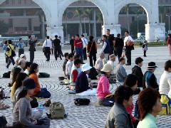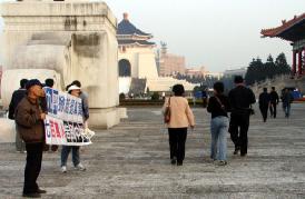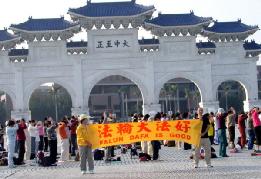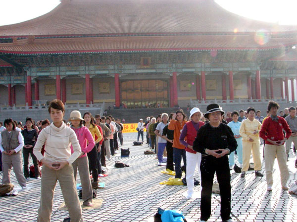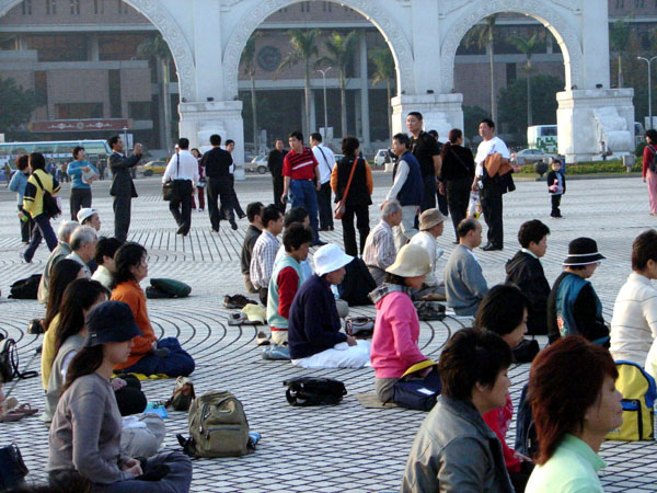 午后,有好几团中国大陆游客陆续到访,突然看到“法轮大法好”的黄色大横幅和这么多炼法轮功的人,好象有点不知所措,几个人窃窃私语,边走边回头看。他们一面走一面听着法轮功学员给他们讲真相。一位大陆游客说他比法轮功学员还明白真相,可是当学员跟他说这里有最新的材料时,他马上接过去迅速的把它放进兜里。当参观完中正纪念堂准备要上车的大陆游客又一次经过炼功的地方时,他们好象下了很大的决心似的,很多人马上抓紧机会迅速的拿起相机快速的拍照,然后若无其事的离开。