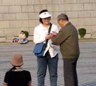 一位拿着相机一直拍照的以色列年轻人说,他没听过法轮功,但是看到这么祥和的功法,他非常有兴趣上网去了解更多的讯息。另一位身材魁梧来自韩国的中国人很疑惑的问,全世界真有这么多人炼法轮功吗?炼了又有什么好处?学员告诉他,全世界不分种族肤色已有七、八十个国家,一亿多的人在修炼,炼法轮功可以让自己变成一个身体健康的好人,他念着书签上写的“真善忍”三个字,点头微笑,收下了真相材料。