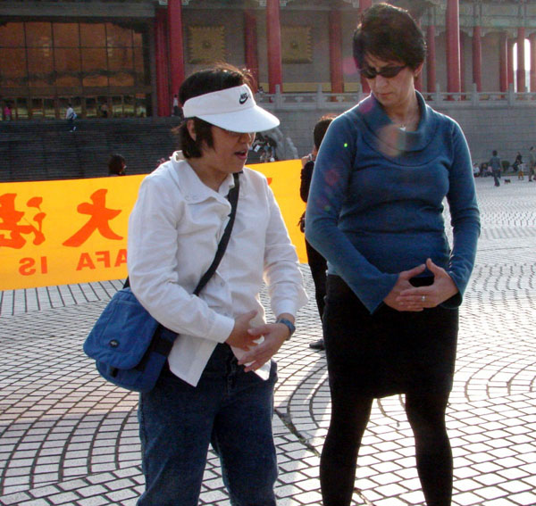 一对来自荷兰的夫妇站在炼功队伍旁看了好一会儿,当法轮功学员趋前向他们介绍后,太太马上加入炼功的行列跟着比划起来。一开始比划她就说能感受到一股很强的能量,看到学员打坐,她很好奇的问,要让头脑安静下来应该是很难的吧?她提到以前曾学过两年的气功,后来气功老师走了,一直想再找一个气功来学,没想到这次来台湾就遇到法轮功,真是太奇妙了。她说回荷兰一定会上网找到炼功点开始学炼。